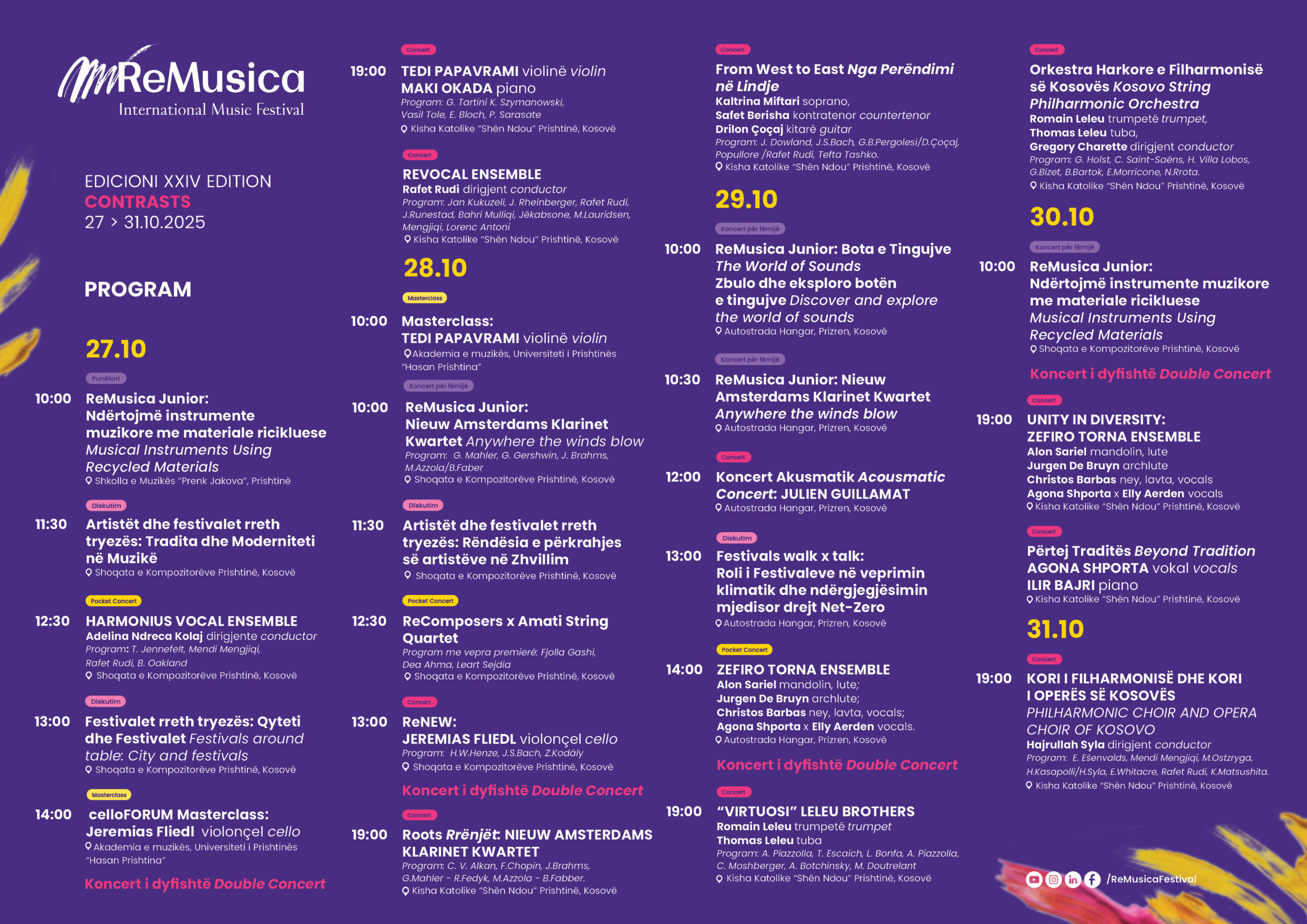 Në skenën e ReMusicas do të ngjiten emra të shquar si violinisti i mirënjohur Tedi Papavrami dhe pianistja Maki Okada, dyshja Leleu Brothers nga Franca – trumpetisti Romain Leleu dhe tubisti Thomas Leleu, ansambli vokal i ReMusicas, ReVocal Ensemble, me dirigjent Rafet Rudi, katërshja atraktive e klarinetëve nga Amsterdami – Nieuw Amsterdams Klarinet Kwartet, Kori dhe Orkestra e Filharmonisë së Kosovës, ansambli Zefiro Torna dhe shumë emra të tjerë! Përtej këtyre koncerteve ReMusica mirëpret ansamblin Zefiro Torna me Alon Sariel, Jurgen de Bruyn, Christos Barbas, Elly Aerden si artistë rezidentë të festivalit dhe 𝗔𝗴𝗼𝗻𝗮 𝗦𝗵𝗽𝗼𝗿𝘁𝗮 e cila i bashkohet ansamblit për një bashkëpunim të veçantë. Programi do të përfshijë edhe koncerte të xhepit ku publiku mund të zbulojë artistë unikë, koncerte tematike apo autorë në fokus.